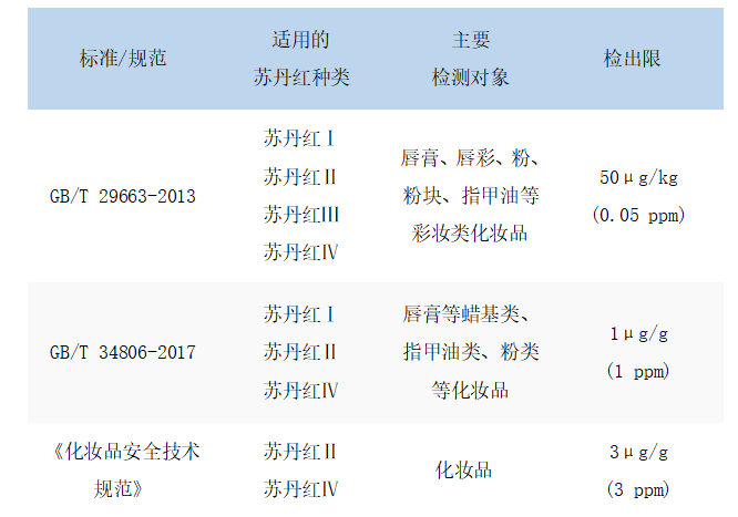 以下为几类标准中分别检测的苏丹红品类和检出限度: