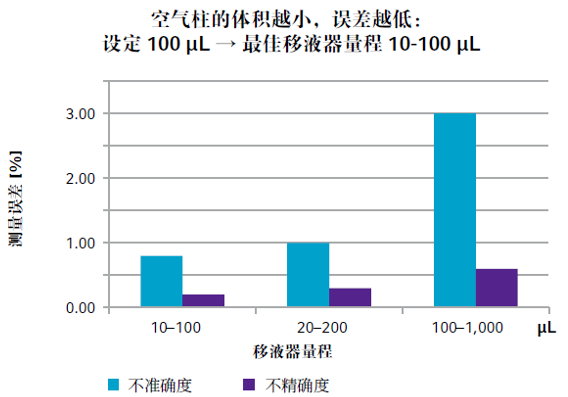 移液器最大量程的 30%-100% 是推荐适用范围。假设实验中需要移取的液体体积为 100 μL,目前有10-100 μL、20-200μL、100-1000 μL这3个量程的移液器可供选择,虽三者均可移取100μL液体,但更推荐大家选择 10-100 μL 量程——吸头内的空气柱体积越小,移液误差越小,实验精度更有保障。