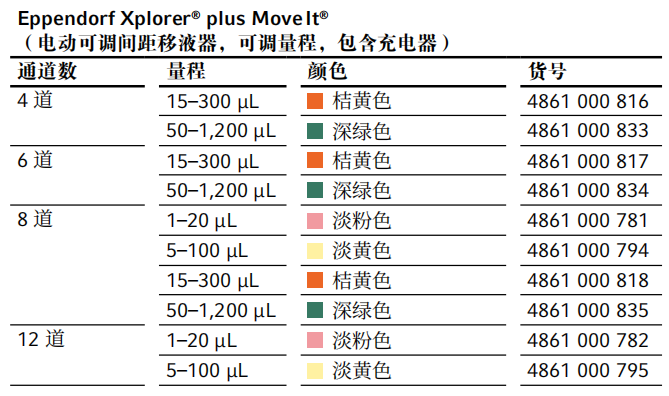 Eppendorf Move It 可调间距移液器分为Research plus 手动款和 Xplorer plus 电动款,均提供4道、6道、8道,以及12道通道数,量程可选择 1μL 到1200μL,间距可在 4.5 mm 至 33 mm 范围内调节(不同量程范围不同)。