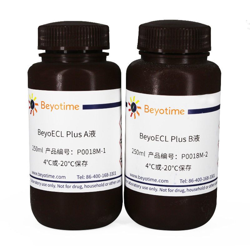 碧云天生产的Western萤光检测试剂BeyoECL Plus是一种超敏ECL化学发光试剂盒,本产品与二抗上偶联的辣根过氧化物酶发生化学反应,发出萤光,从而可以通过用X光片压片或其它适当化学发光成像设备检测样品。