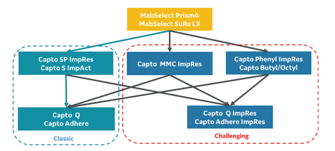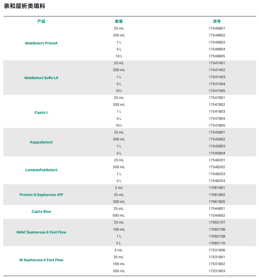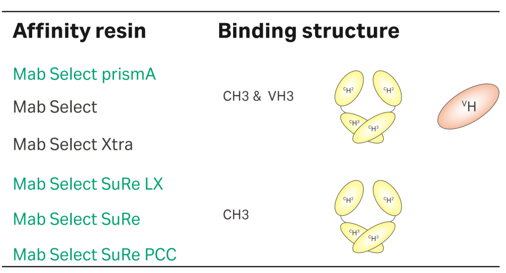 Cytiva 有多种Fc结合的亲和层析填料可供选择(如下图),MabSelect PrismA/Mabselect SuRe LX 载量更高,耐碱性更强,尤其是粒径60 μm的PrismA 可耐受 1.0 M NaOH,150 cycle 的清洗,且具有更高的分辨率,可作为此类分子设计 BsAb 亲和层析的更优选择。