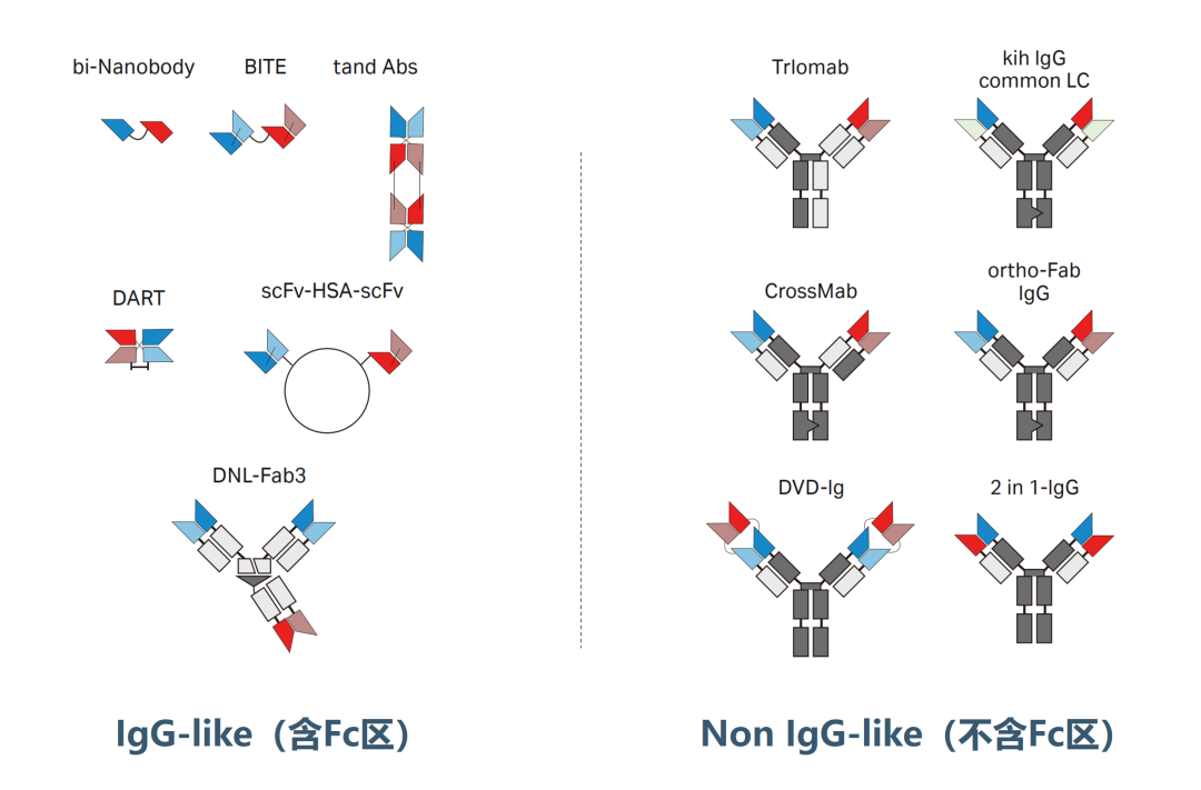 双抗主要由基因重组技术进行生产,分子设计类型多样,满足双抗分子识别两种不同抗原的能力。根据是否含Fc片段可以将双抗分为lgG-like和Non lgG-like 两类。