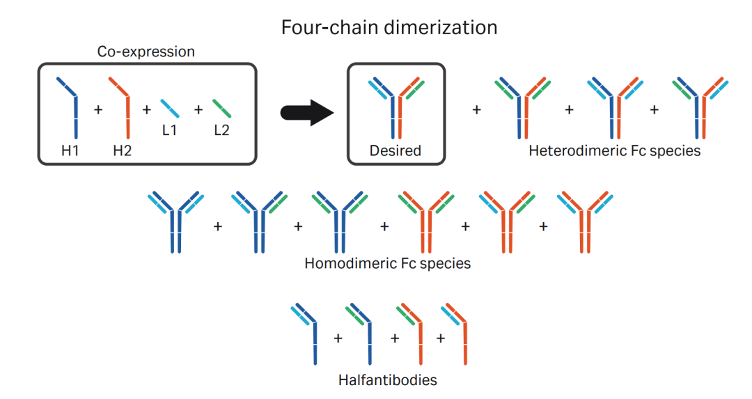 错配问题:在细胞培养过程中,由于多种重链(HC)和轻链(LC)的共表达,双抗容易发生HC和LC的错配现象,导致大量具有相似大小和性质的非功能性或单特异性抗体的产生。若完全随机配对,错配产物的比例可能会超过90%。