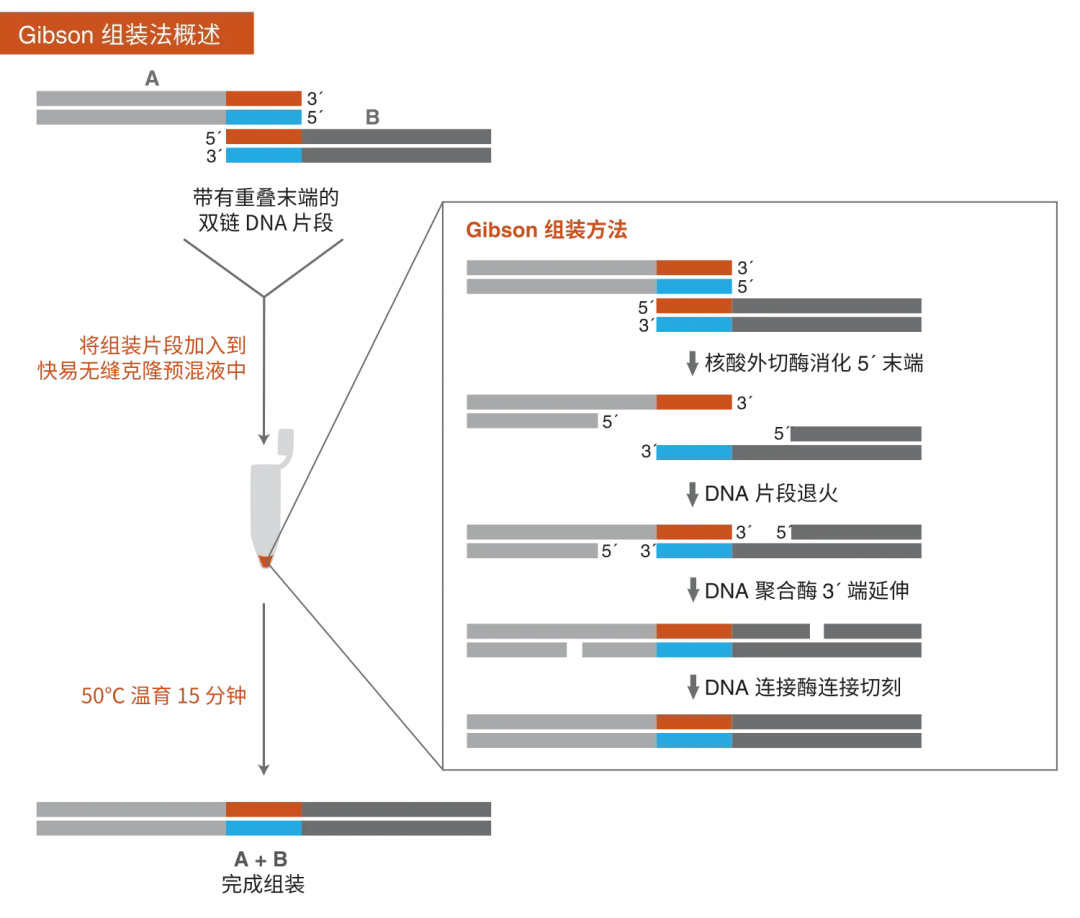 快易无缝克隆采用Gibson组装技术,该方法可以在线性化载体的几乎任何位置插入一个或多个DNA片段,并且不依赖于特定序列中限制性位点的存在来进行合成或克隆。因此,用户可以完全控制组装的内容,并且可以避免由于多片段组装而引入无关序列。此外,相较于使用限制性内切酶的传统克隆方法,基于Gibson组装的快易无缝克隆速度更快。不仅如此,相较于传统克隆方法,快易无缝克隆可以在单次反应中更高效的连接多个DNA片段。