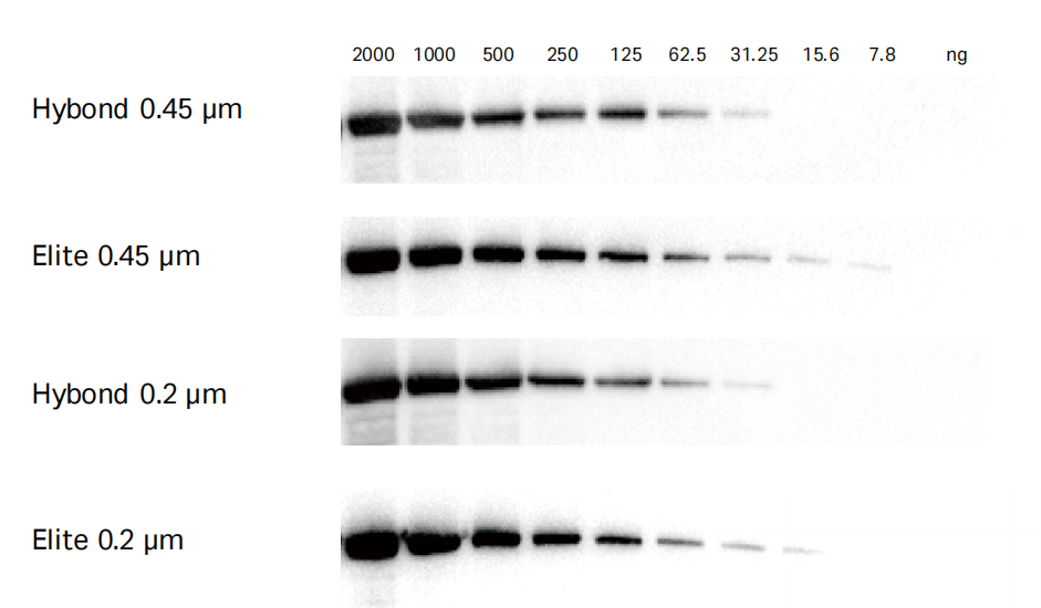 在相同实验条件下,相比经典的Cytiva Amersham Hybond PVDF膜,全新Elite PVDF转印膜能够曝光出低至7.8 ng的蛋白条带,就算是低丰度蛋白也能清晰检出,再也不用担心珍贵样本的信号丢失。