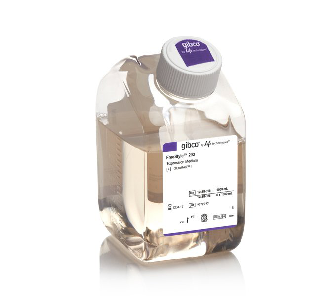 Gibco® FreeStyle™ 293 表达培养基为即用型产品。不需要添加血清、谷氨酰胺或表面活性剂。Gibco® FreeStyle™ 293 表达培养基含有 GlutaMAX™ 补充剂,使用易于使用的规格能够尽可能减少毒性氨积聚,并可提高细胞活力和生长率。