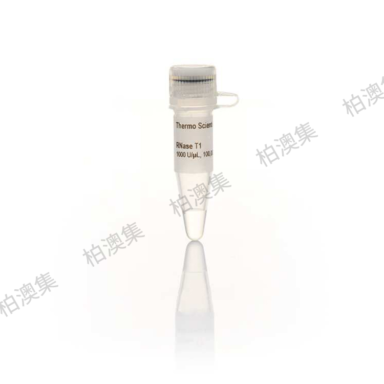 Thermo Scientific RNase T1 是一种核糖核酸内切酶,可特异性降解在 G 残基处的单链 RNA。其通过形成相应的中间体 2', 3'-环磷酸盐,切割相邻核苷酸的 3'-鸟苷残基和 5'-OH 残基之间的磷酸二酯键。反应产物为 3'-GMP 和含末端 3'-GMP 的寡核苷酸。