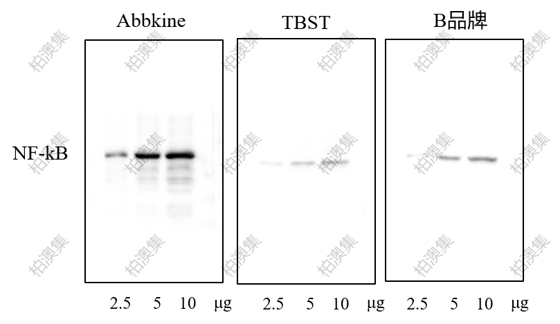 Fig.1.Superkine™ 增强型抗体稀释液(BMU103-CN)与普通抗体稀释液(TBST)以及同级竞品(B品牌)进行对比WB实验,显示Superkine™ 稀释液信噪比更高。 样本: HEK293细胞; 一抗:小鼠抗NFkBp65单抗(ABM0017,1:5000)。