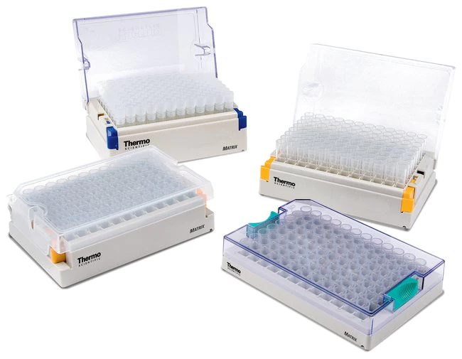 采用本款 Matrix™ 二维码储存管适配型 ANSI 格式空支架创建制式排列布局。本款支架拥有专利的特殊设计,可叠放微孔板,具有能保护样品的可锁定盖子。